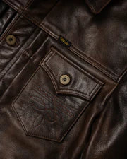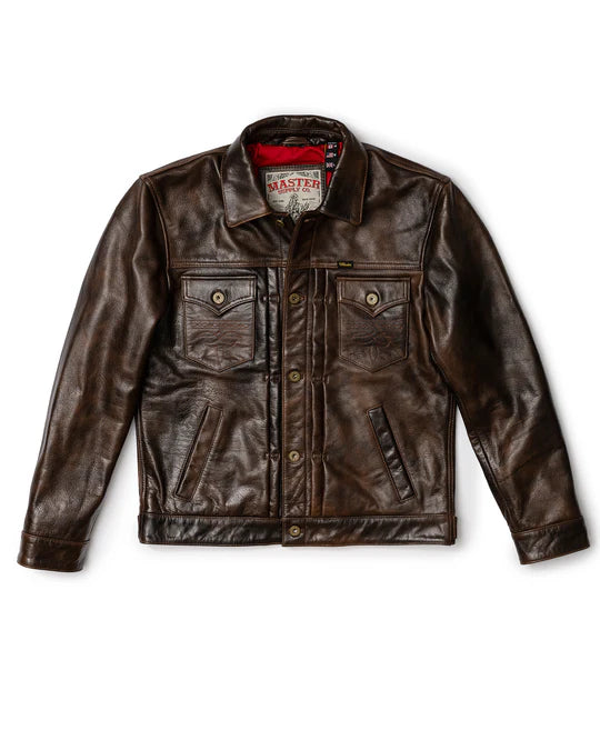 The "Convoy" is a premium leather trucker jacket made by Master Supply Co., modeled after the legendary Type II denim jacket style. This version is made from Shinki horsehide or a similarly high-grade vegetable-tanned leather in a rich rust brown finish that will age beautifully over time.
